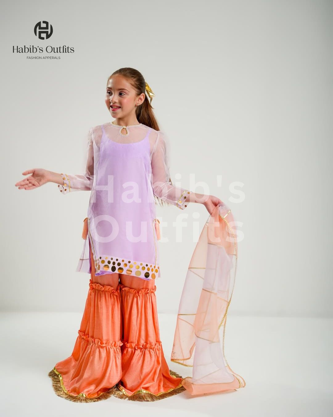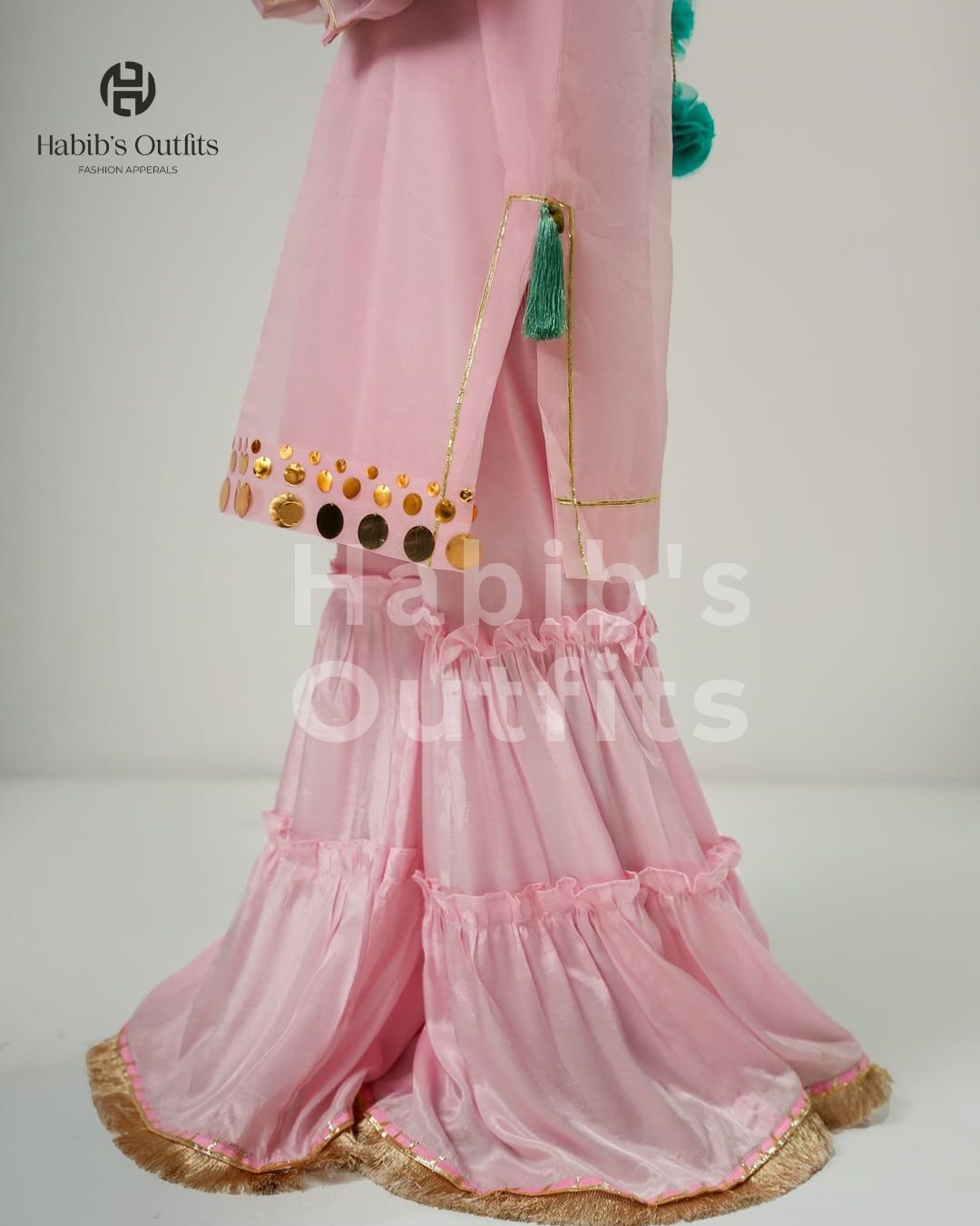 Crafted from fine-quality organza fabric for the shirt, offering a soft and elegant drape. The layered gharara and multi-shaded dupatta complete this look with finesse.