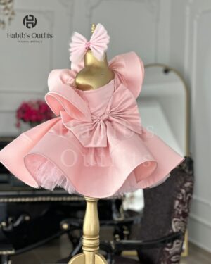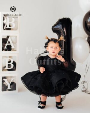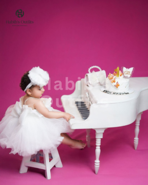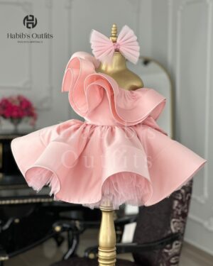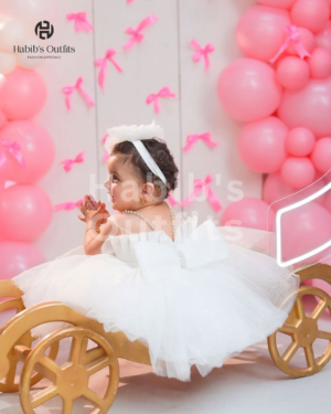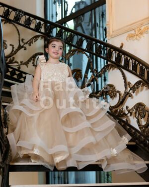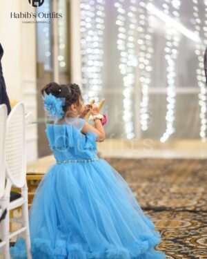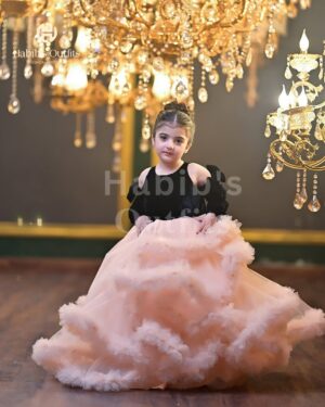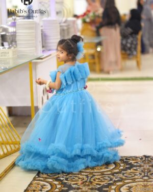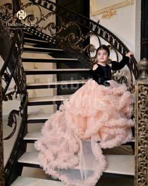 Style & Features This elegant maxi-style frock features a stunning long tail at the back creating a graceful and fairytale-like appearance The bodice is adorned with intricate panel work along with butter palace flowers in a 3D handcrafted design The hemline mirrors the same floral panel detailing beautifully enhanced with delicate pearl embellishments The can-can layers bon patti and structured strips add volume and charm making it a perfect choice for special occasions